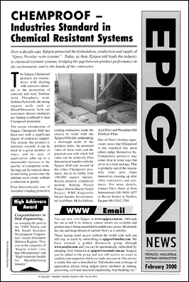 Chemproof, the Epigen Epoxy Novalac polymer so well regarded by the chemical processing industry in its fight against the corrosive effects of acids on concrete and steel, has been accorded Tradename registration. Since 1988, the Chemproof has carved out reputation that is envied and sought after by many.