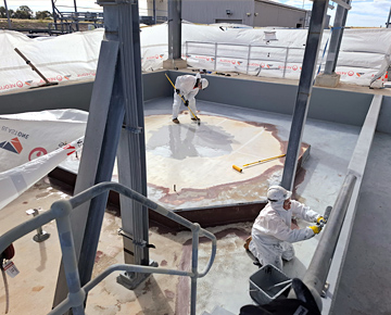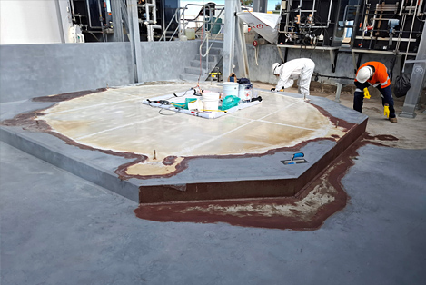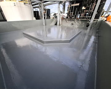The project involved removal of all loose Polyurea, leaving well adhered material in place. All surfaces including the concrete was wet abrasive blasted, along with some steel members within the bund. Leading edges of the remaining Polyurea were faired using Epigen 402 + Garnet as the aggregate, and the Epigen Chemproof applied to all sufaces, floors and walls.